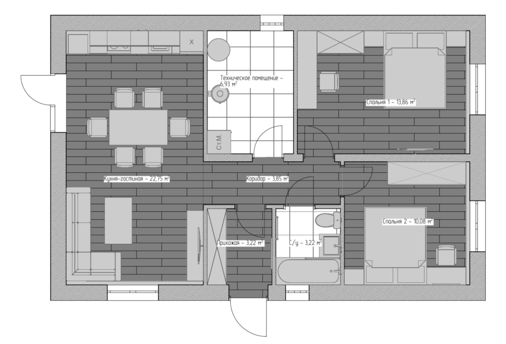 Две спальни — 13,86 м² и 10,08 м²